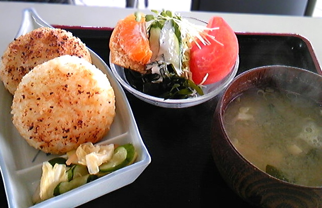 祖母は、焼きおにぎりに味噌汁とサラダをつけてみました。